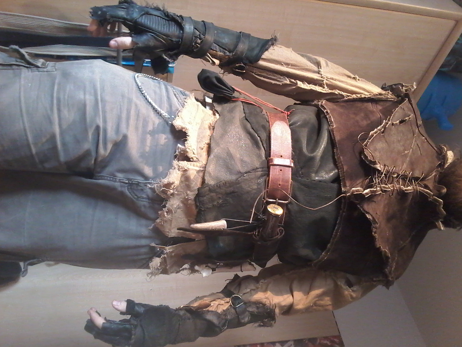 Also hi erstmal. An sich ist das was du da hast ziemlich brauchbar. Vllt denkst du drüber nach den Charakter von innen nach außen zu gestalten. Oder unten nach oben. Also mit der untersten Schicht anfangen. Soll heißen beschaff dir Stoff ( am besten Leinen Stoff, vllt die Indira Tagesdecke in Beige von Ikea) und Nähe dir eine Tunika. Meine Untetklamotter war um ein etwas gröberer Deckenbezug. Hab 3Löcher für Arme und Kopf rein geschnitten und das ding wie ein T Shirt angezogen. Hab dann grob auf Gürtelhöhe abgemessen (im Nachinein hätte ichs auf etwas oberhalb der Knie machen sollen) und durchgeschnitten. Den restlichen Stoff nutzte ich für meine Arme. Hab den Stoff über meinen Arm gelegt, eine Röhre gelegt und zusammengenäht. Den überschüssigen Stoff habe ich abgeschnitten. So hätte ich einen Ärmel den ich an den Körper nähen konnte. Das gleiche tat ich mit dem restlichen Zeug und dem anderen Arm. So hatte ich fix ne Tunika. Ohne Maßband. Nur mit Augenmaß. Unter Worgahrs Gewandungsdoku sind Bilder. Also war echt nicht Schwer. Habe dann überall rumgerissen und die Risse mit Wurstgarn wieder zugenäht. Im Grunde habe ich nur mit Wurstgarn genäht.