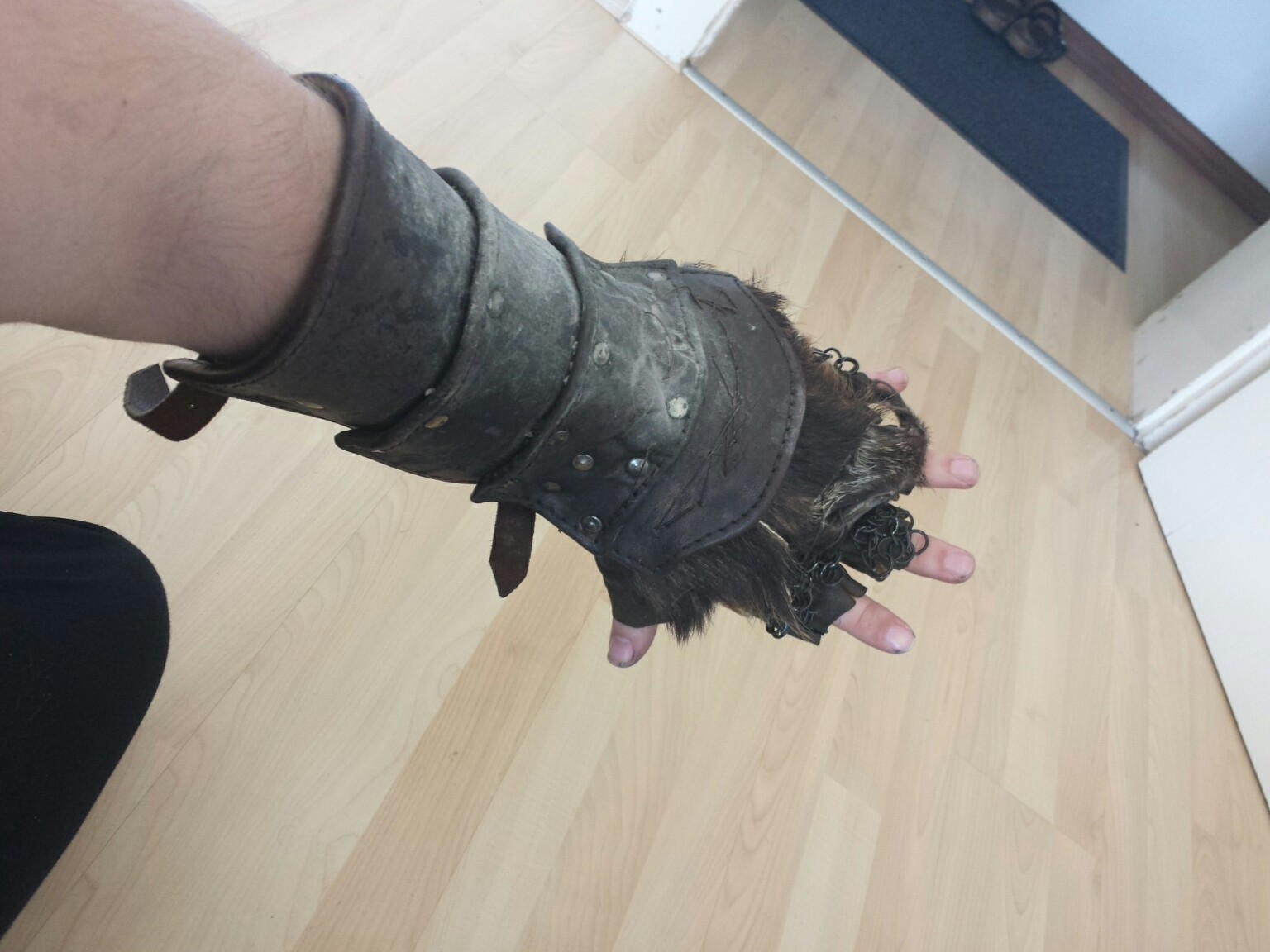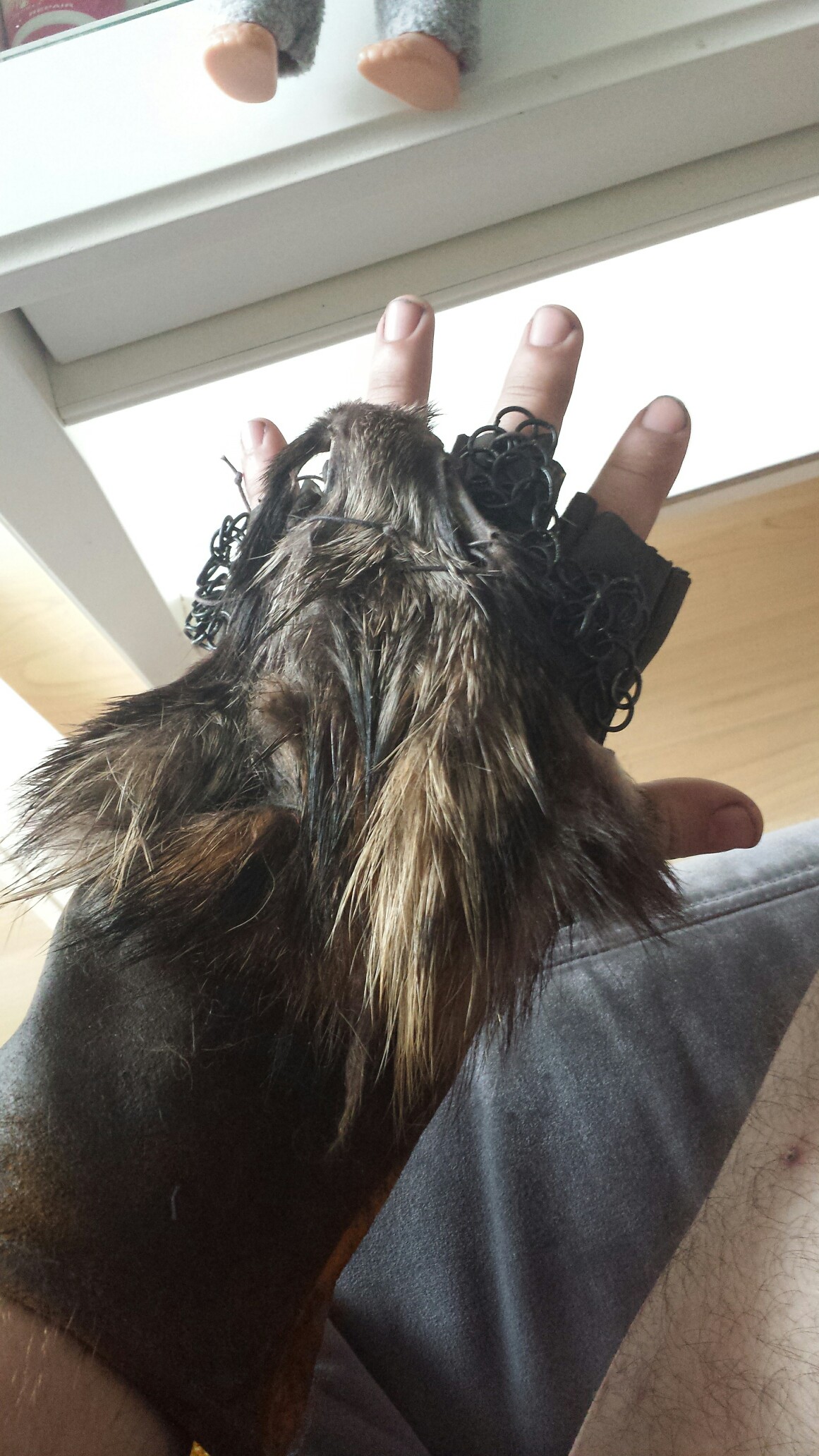 Ich will ehrlich sein, das ich das Fell auf dem Handrücken etwas unglücklich finde. Ich hätte es eher auf den Unterarm genäht. So hättest du auch die Kettenteile bis auf den Handrücken erweitern können.