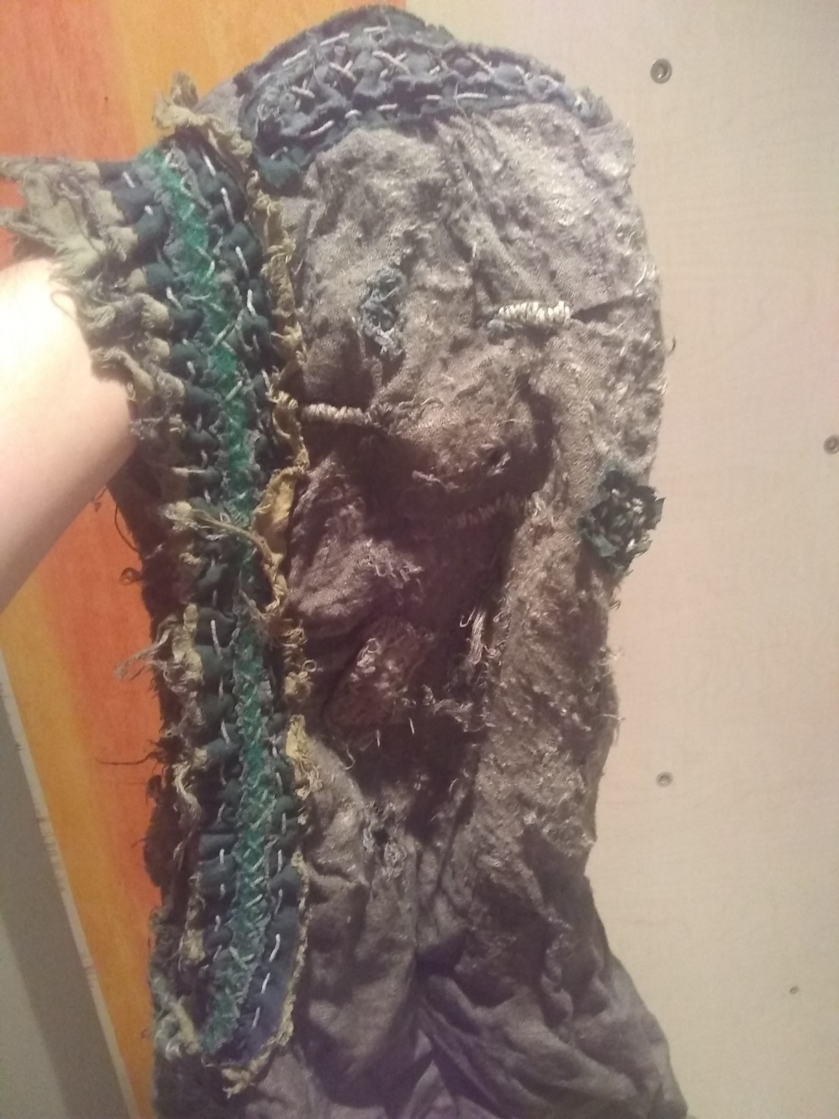 Muss halt noch Mal etwas mit braun färben und dann halt noch mit schwarz Flecken machen, dann ist die fertig. Und die Guggel ist nun klein genug für unter den Mantel.