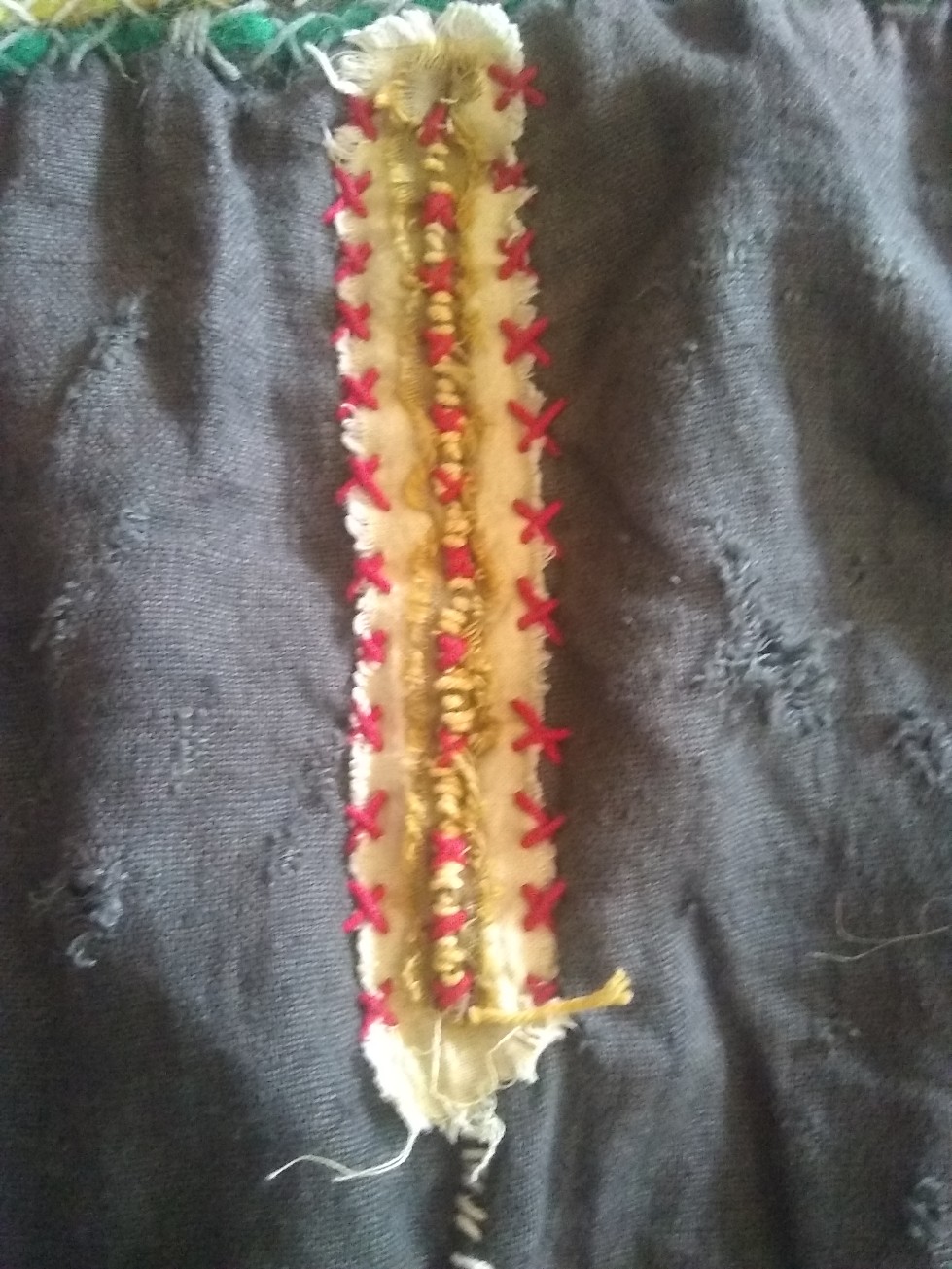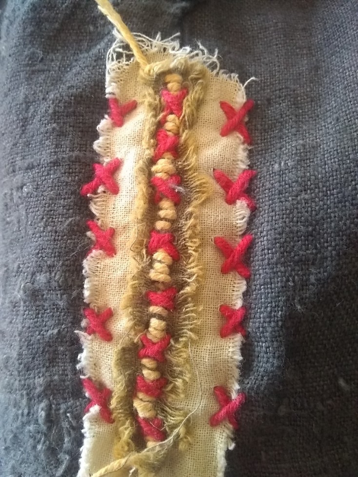 Ich hab bei meinem Mantel angefangen ein wenig mehr auf die Optik Wert zu legen und hoffe daß er nun so langsam mehr nach "Wikinger" aussieht. Da ich leider keine Webborte gefunden habe, die für mich dafür entschieden selbst etwas passendes zu weben, was natürlich nicht funktioniert hat. Daher habe ich eine "Fake" Variante gestickt (ist aufwendig wie die Sau und ich muss noch zwei große Stücke machen).
