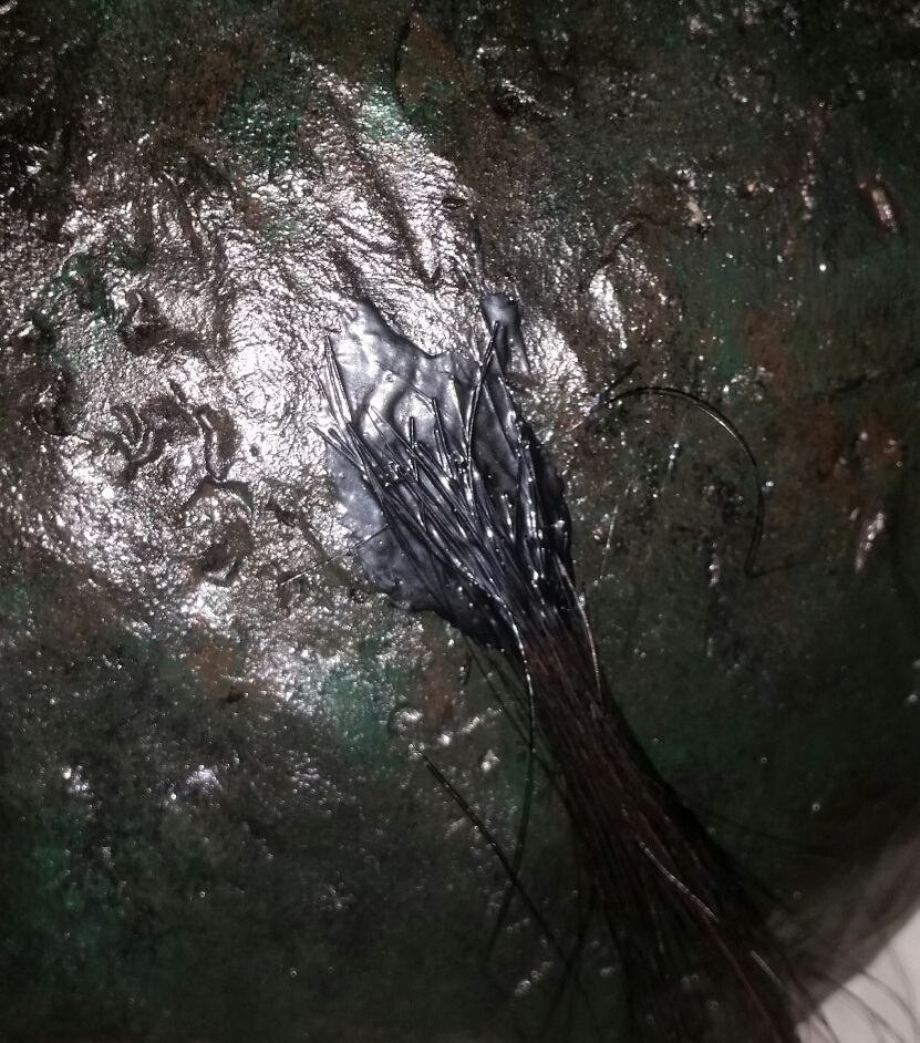 Etwas weniger Latex und am Haaransatz später nimmst du weniger Haare und fächerst die oben etwas auseinander so das der Ansatz etwas natürlicher aussieht. Das schwarze Latex musst du später fann wieder übermalen. Aus dem Grund klebe och Haare meist zuerst und dann bemale ich