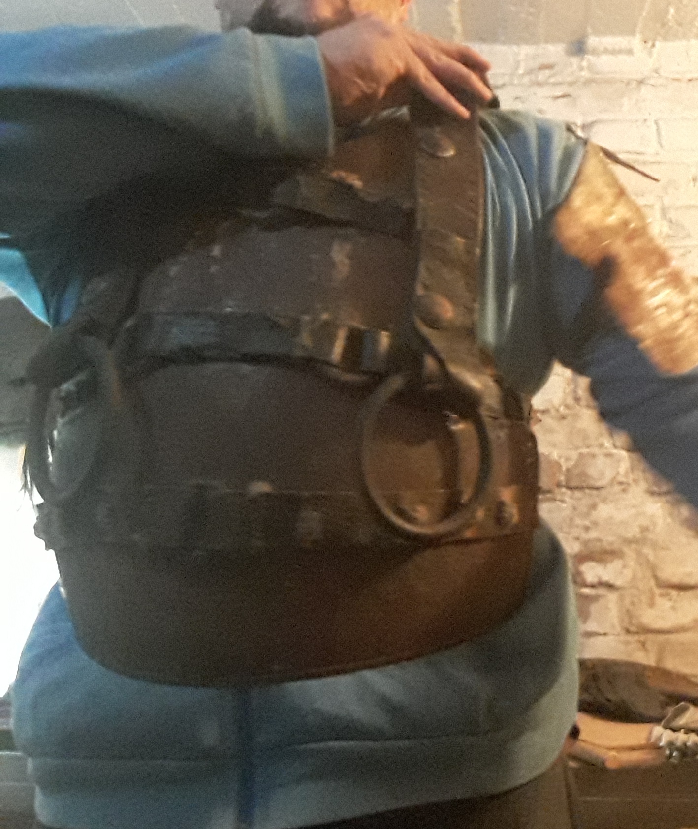 Wichtiger als das ist aber noch die große Freie Fläche der Brustplatte zu brechen. Das Zeichen ist schonmal ne gute Idee. Vllt nietest. Du auch n Lederriemen einfach quer darüber. Solche Riemen wie von alten Geschirren mit schön korrodierten Eisenringen. Gibt's immer Mal wieder für kleines Geld auf eBay.