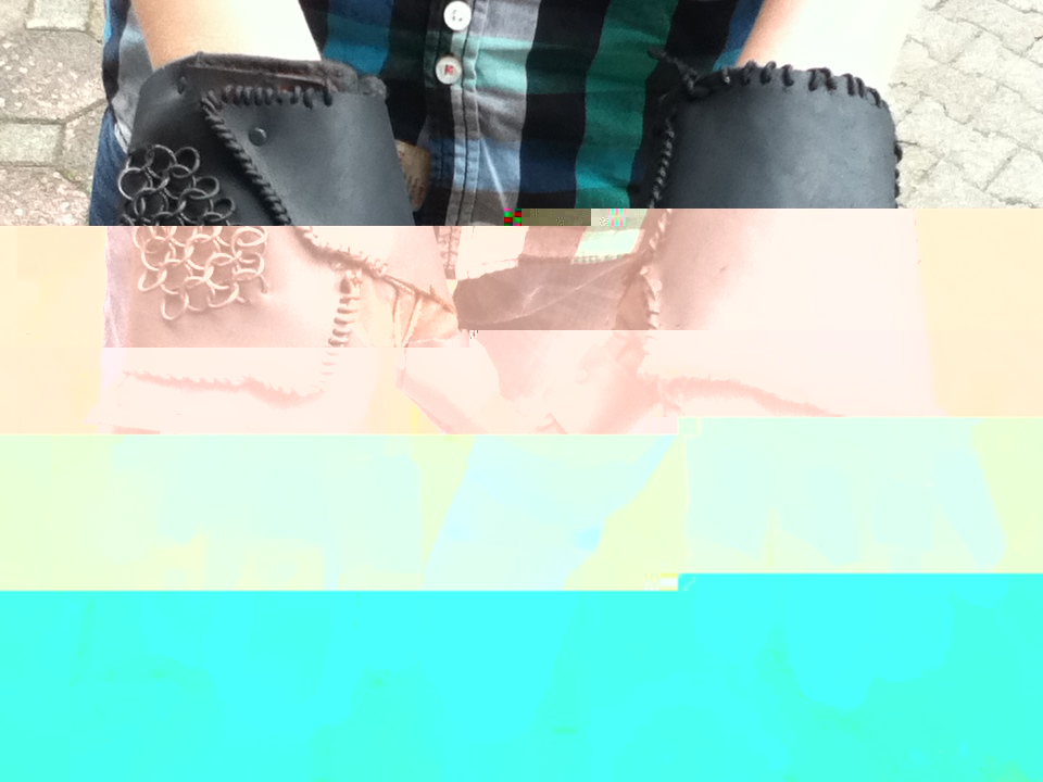 Hab jetzt mal die Lederschnüre drangemacht, einen Handschuh dann mit Acrylfarbe irgendwie schwarz gemacht (zu viel benutzt)
