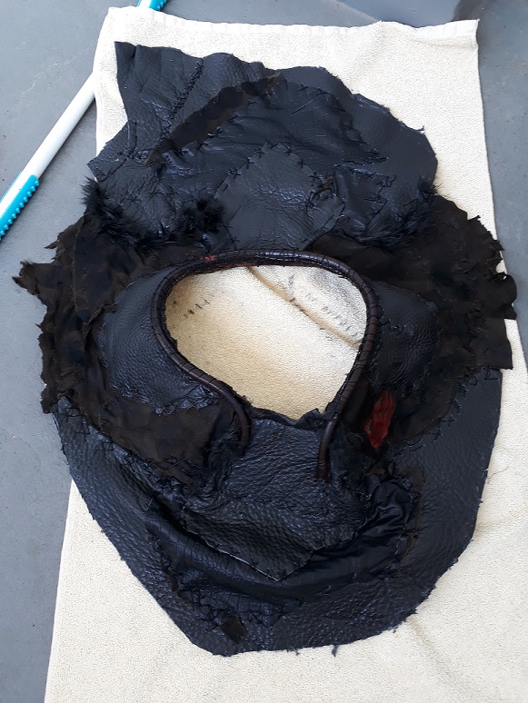 Ein Gummiband in Leder eingenäht ergab zumindest schon einmal den Teil, der dann die Maske am Gesicht festhalten sollte. Das überstehende Leder fiel an sich schon recht gut dann nach hinten und musste nur noch mit wenigen Abnähern versehen und unten zum Schlauch zusammengenäht werden. Ein Problem waren die Löcher für die Ohren, die nur die Orkohren durchlassen sollten und nicht auch noch Teile meines blonden Menschenschopfes. (Da werkel ich auch grad noch ein wenig herum, damit es gut passt). Das Überschussleder vorn habe ich mit einer Schlaufe und einem Holzknebel versehen, die das Ganze vorne zusammenhalten und auf meinem Kopf fixiert. Gleichzeitig ergibt sich damit auch eine Halsabtarnung (auch das muss noch verfeinert werden).