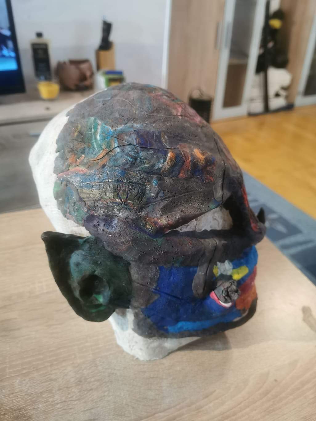 Es sieht streng genommen so aus als würdest du gerade erst anfangen daran zu arbeiten. Als hättest du jetzt die Knete drauf gepackt um nun ein Gesicht daraus zu machen.