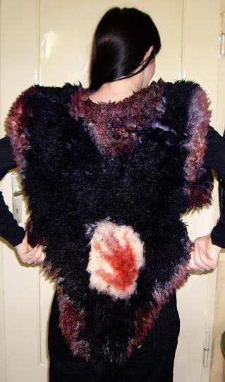 Hab mir den Rand dunkelrot gefärbt, nen roten Handabdruch auf den Rücken gemacht und den Rest (noch nicht ganz ^^) schwarz gefärbt. Durch das mehrfache Ausspülen und trocknen haben sich bei dem Fell die Haare zusammengeknäult wies bei nem Schaf eigentlich auch aussieht. Noch selbst n bischen nachhelfen mit verfilzen und fertig.