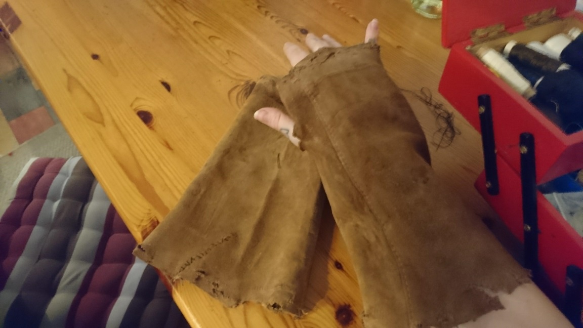 In dem Lederhaufen, aus dem ich die Weste nähe waren außerdem noch Lederjackenärmel, die ich zu Stulpen umfunktioniert habe.