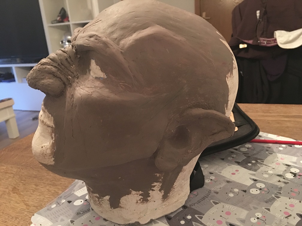 Mit dem Abbild meines Schädels wurde dann mittels Knetmasse versucht Rakhnûr ein Gesicht zu geben (leider gibt es von der aktuellen, überarbeiteten, Version keine Bilder, da die Maske schon beim Abgipsen ist und ich es schlichtweg vergessen habe):