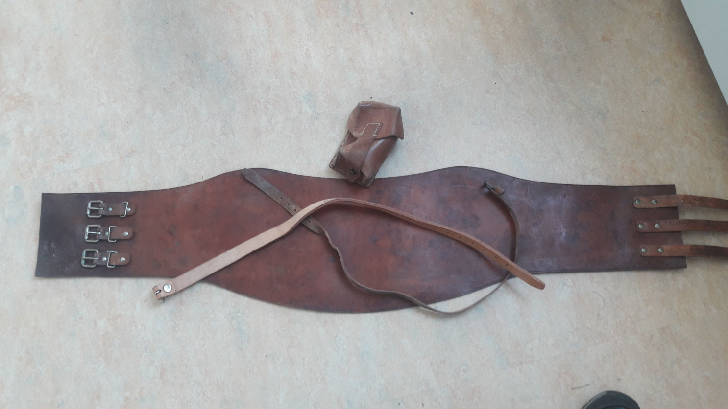 Den Gürtel hab ich gestern abend auch noch passend gemacht.. 4mm knüppelhartes Leder - ich komm mit meiner Ahle nicht mal durch die Oberschicht.... hab dann die Nieten der orignalen Befestigungen ausgebohrt, das war einfacher :idi:
