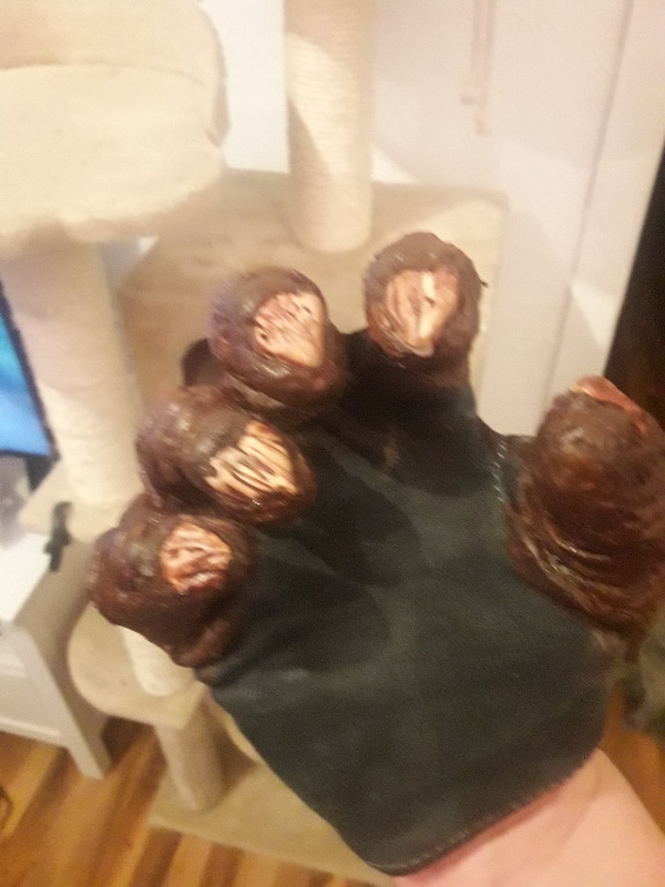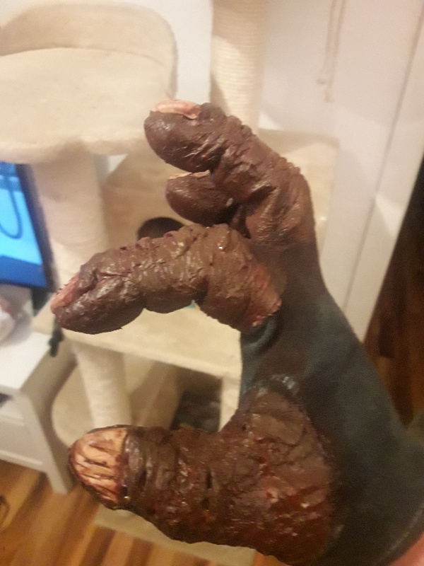 Hab mich mal an ein paar Latex Fingern gewagt. Die Grundlage sind gefärbte Allergiker Handschuhe, die Fingernägel sind aus Fimo und drauf genäht. Die eigentlichen Finger sind dann Latex mit Küchenrolle.