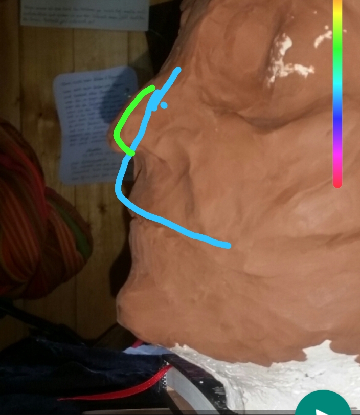 Ich denke wenn du beide Nasolabialfalten gleichmäßig tief modellierst wird sich gehörig was an der Optik tun. Achte darauf das der/die Ton/Modeliermasse in dem "'Dreieck" schön dünn ist. Für später genug Grip im Gesicht.
