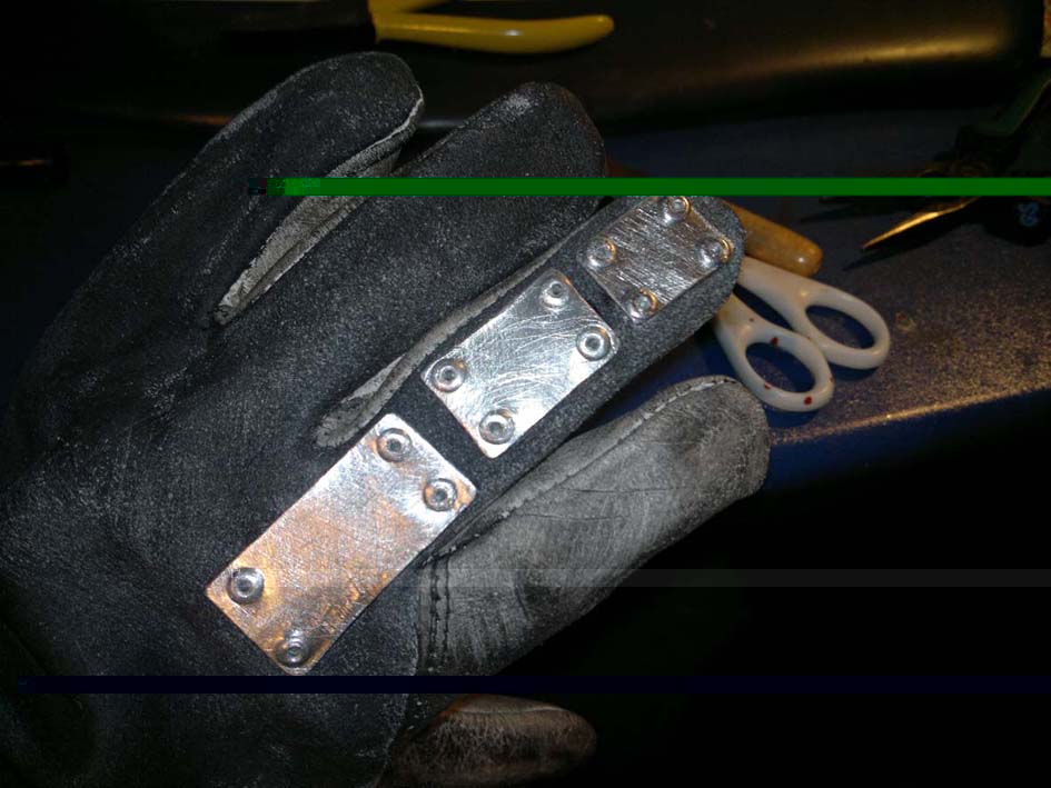 So das ist der Anfang von einem gepanzerten Handschuh. Die Kanten und alles sind rundgeschliffen es besteht also keinerlei Verletzungsgefahr. Wenn es Verbesserungsvorschläge gibt immer her damit