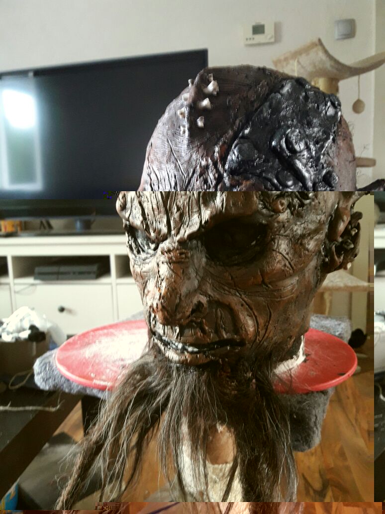 This Mask is for one of our Goblins. The first picture on page 3 of this thread shows his old one. Making the mold for the ok mask, I got too much air chambers in the both ears. So I'd casted the mask without ears and tried to make a new mold for the ears separately. Than I put the ears on the mask. And this looked kinda shitty, and I promised Razzlak to make him a new one. In addition to that, his old mask totally fucked up on DF 2016