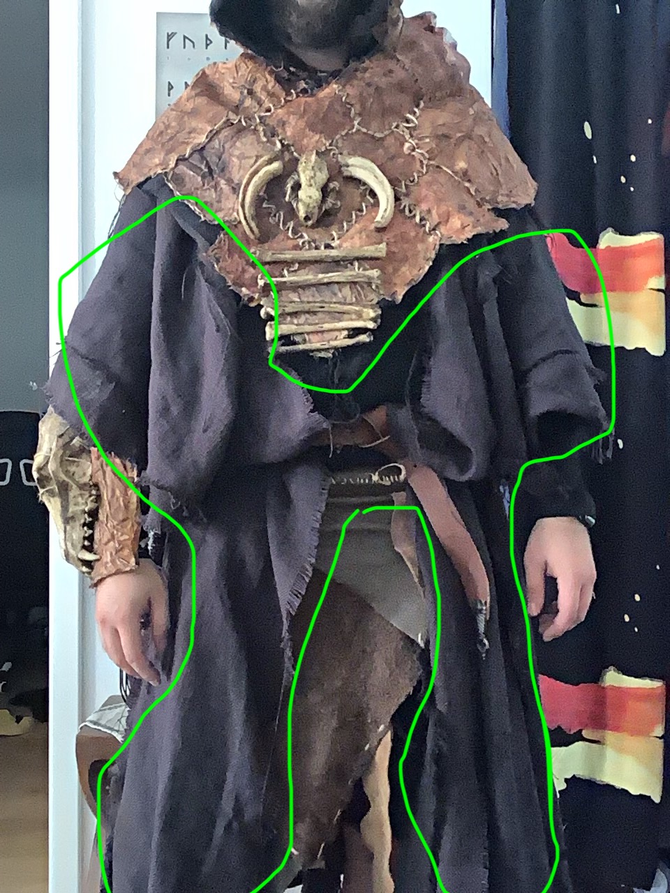 mit etwas Struktur. Diese Perlenkette könntest du zb über die Brust spannen. Generell könnten dem Mantel noch Nähte und Applikationen gut tun. Hast du einen Clan oder Trupp mit einem Symbol? Hast du diverse Götter/Ahnen/Geister die du anbetest und die spezielle Zeichen haben die du vllt auf Leser anbringen kannst und das Leder könntest du dann wiederum festnähen