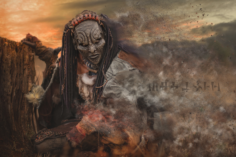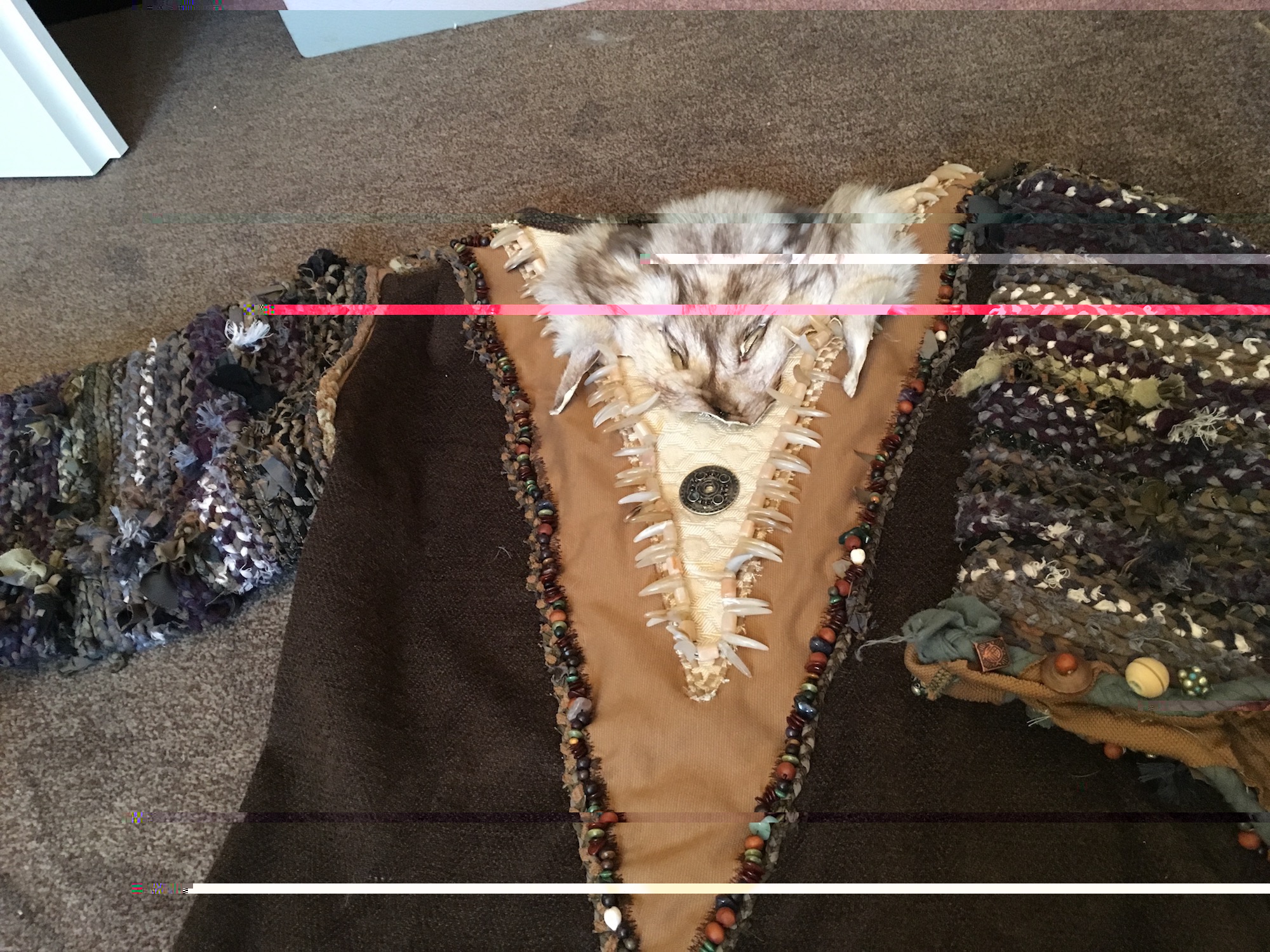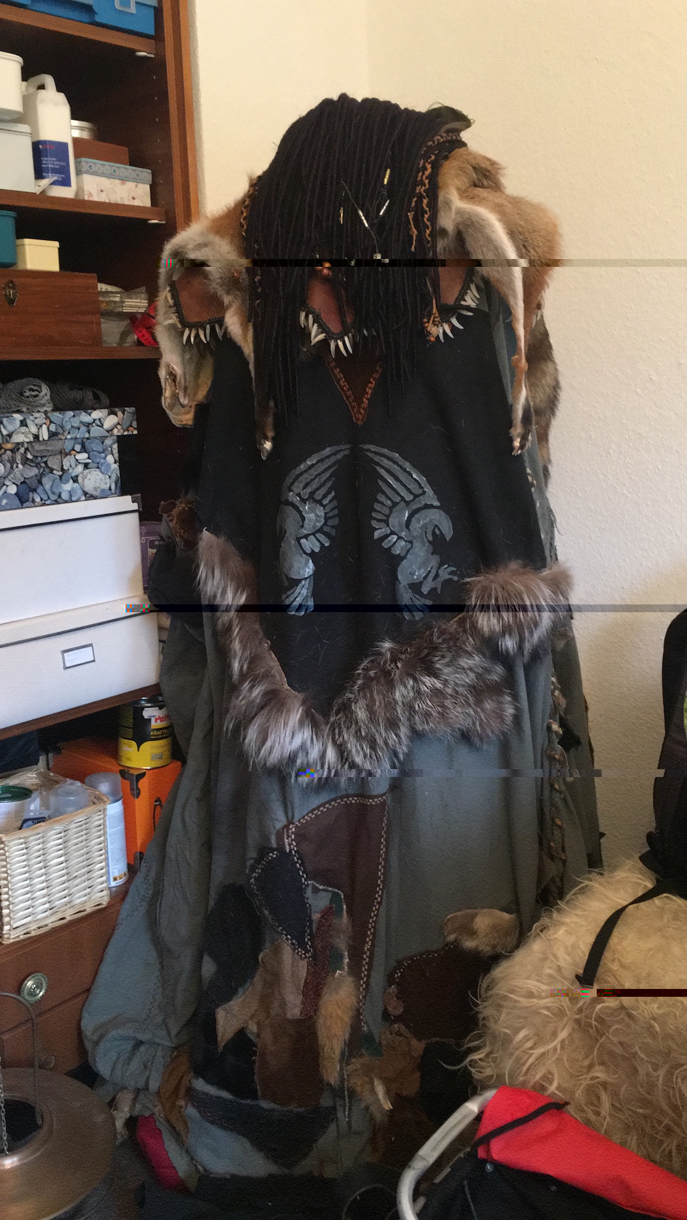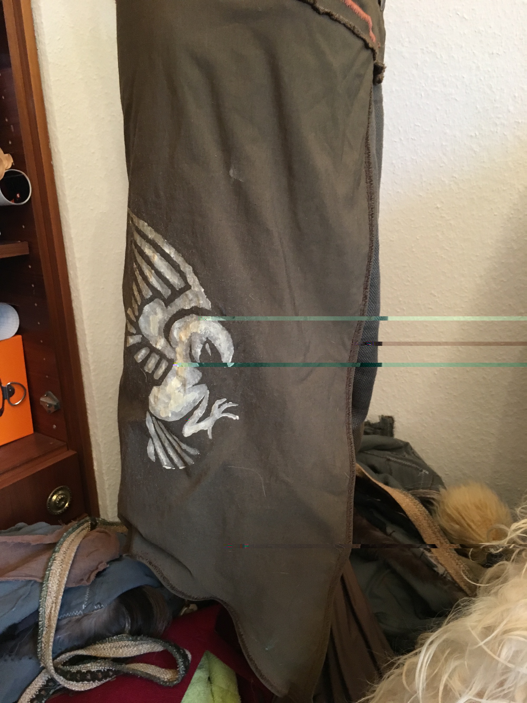 Umhang ist ursprünglich von einem anderen Kostüm. Da habe ich nur noch mehr Flicken, Fell und Kram raufgenäht. Ach ja, und Dreck!