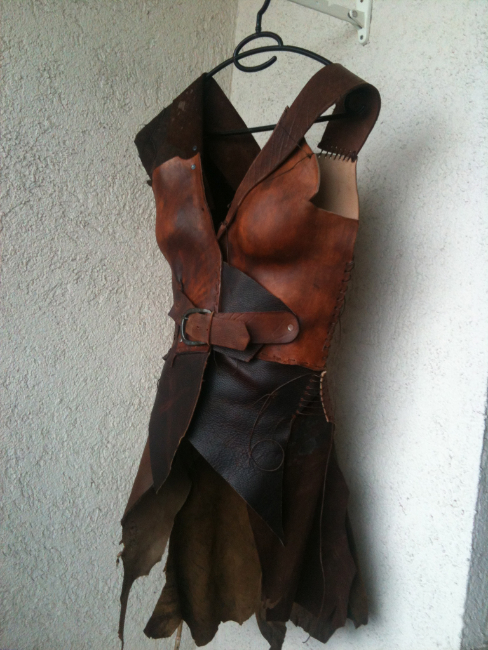 die beinschienen sind ursprünglich chaps vom reiten, auf die ich fell und lederfetzen